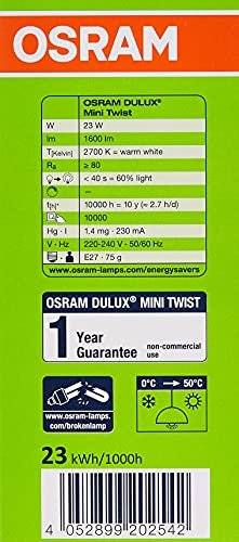 The Osram Dulux Smalltar Mini Twist delivers soft warm white light with full brightness instantly. Ideal replacement for incandescent bulbs, it offers 100% light with no warm-up time and no mercury content.