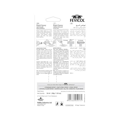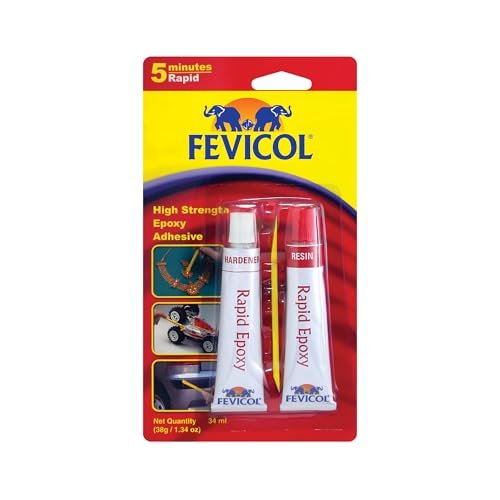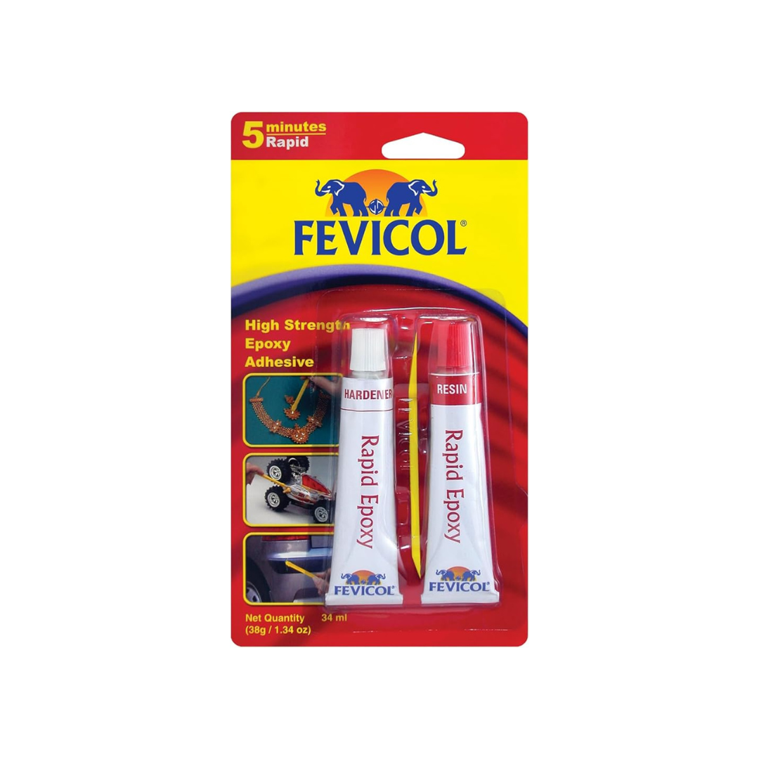 Fevicol Rapid Epoxy is a 5-minute curing, high-strength adhesive for metal, wood, glass, ceramic, and plastic. The 34ml dual-tube design ensures perfect mixing and rapid results.